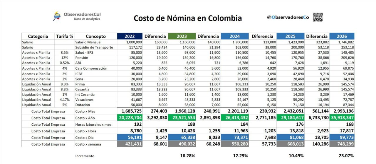 Indicó que, sin auxilio de transporte, para 2026 se pasará a un salario vital familiar de 1’746.882 pesos, cifra “que implica un crecimiento respecto a este año, que aún no termina, de 22,7 por ciento”.