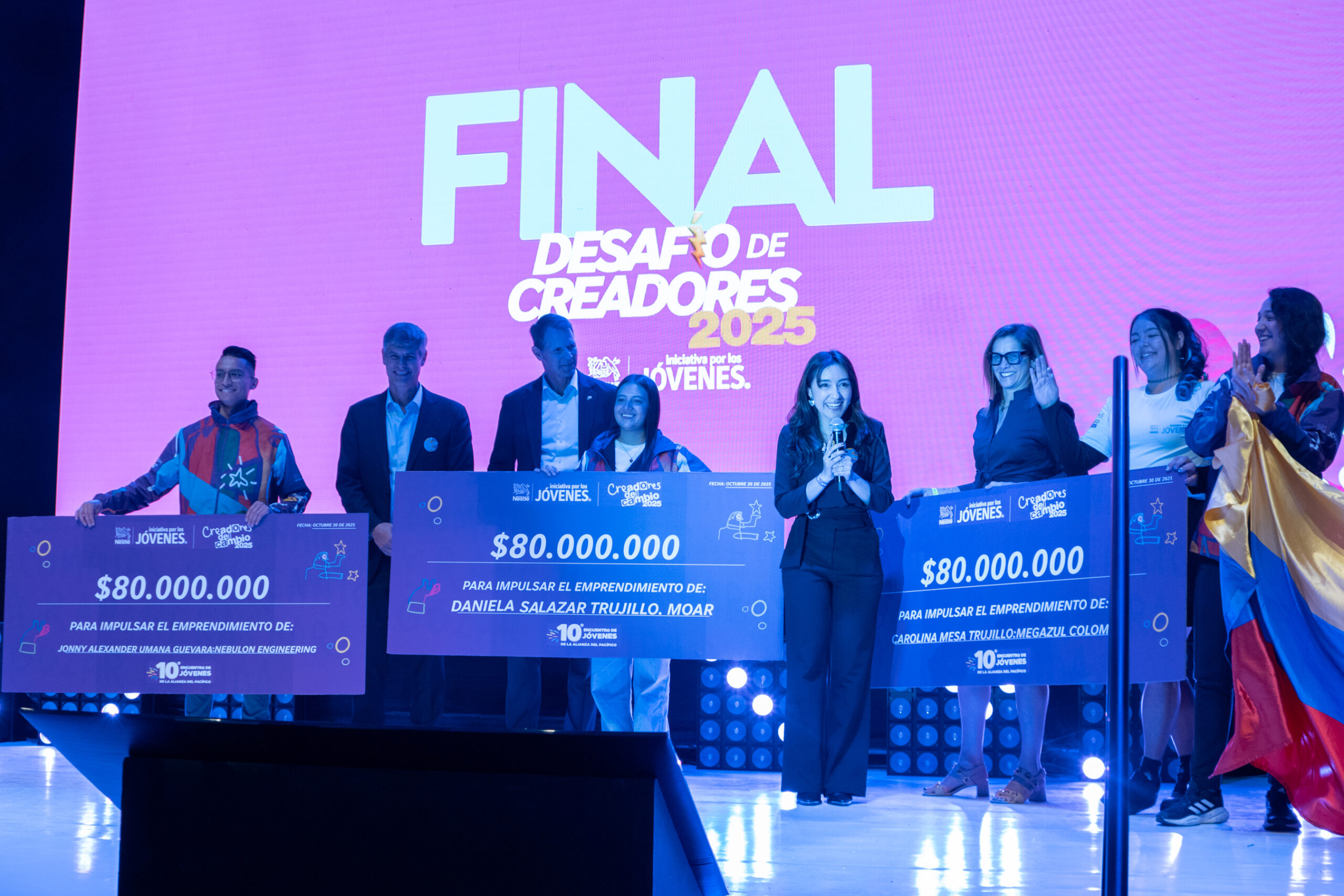 Bogotá, 12 de noviembre de 2025. Jonny Alexander Umaña, creador de Nebulon Engineering; Daniela Salazar de Moar; y Carolina Mesa del proyecto Megazul Colombia, fueron los tres ganadores de la segunda edición del Desafío Creadores, una iniciativa orientada a impulsar el talento, innovación y la generación de oportunidades para jóvenes emprendedores en Colombia.