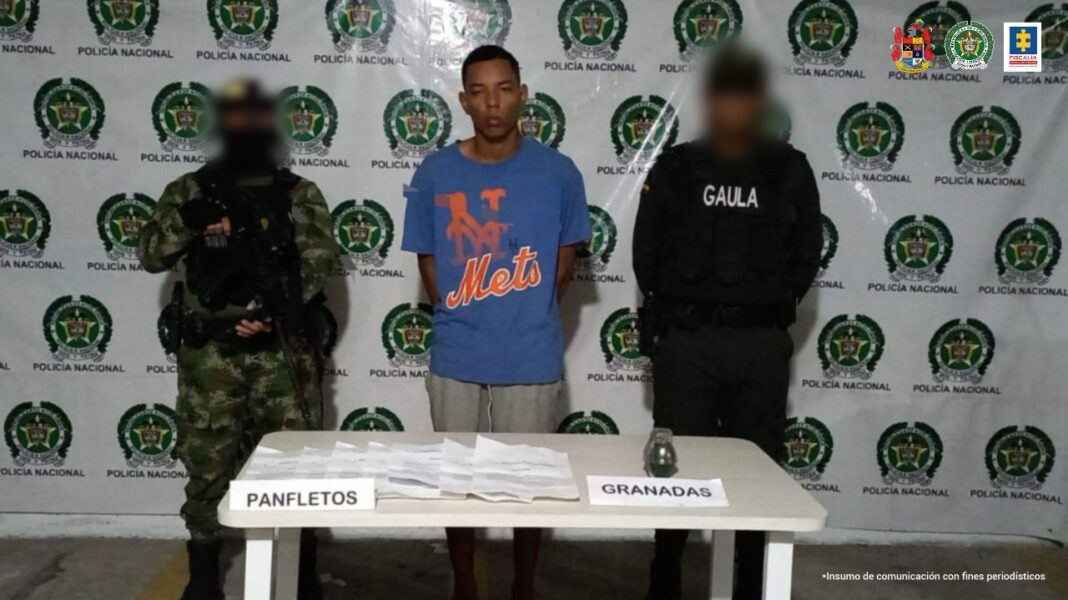 Funcionarios adscritos al Gaula de la Policía Nacional materializaron su captura el pasado 12 de enero en el barrio Las Nieves de la capital del Atlántico. En su poder hallaron una granada de fragmentación y 7 panfletos alusivos a la señalada estructura criminal armada.