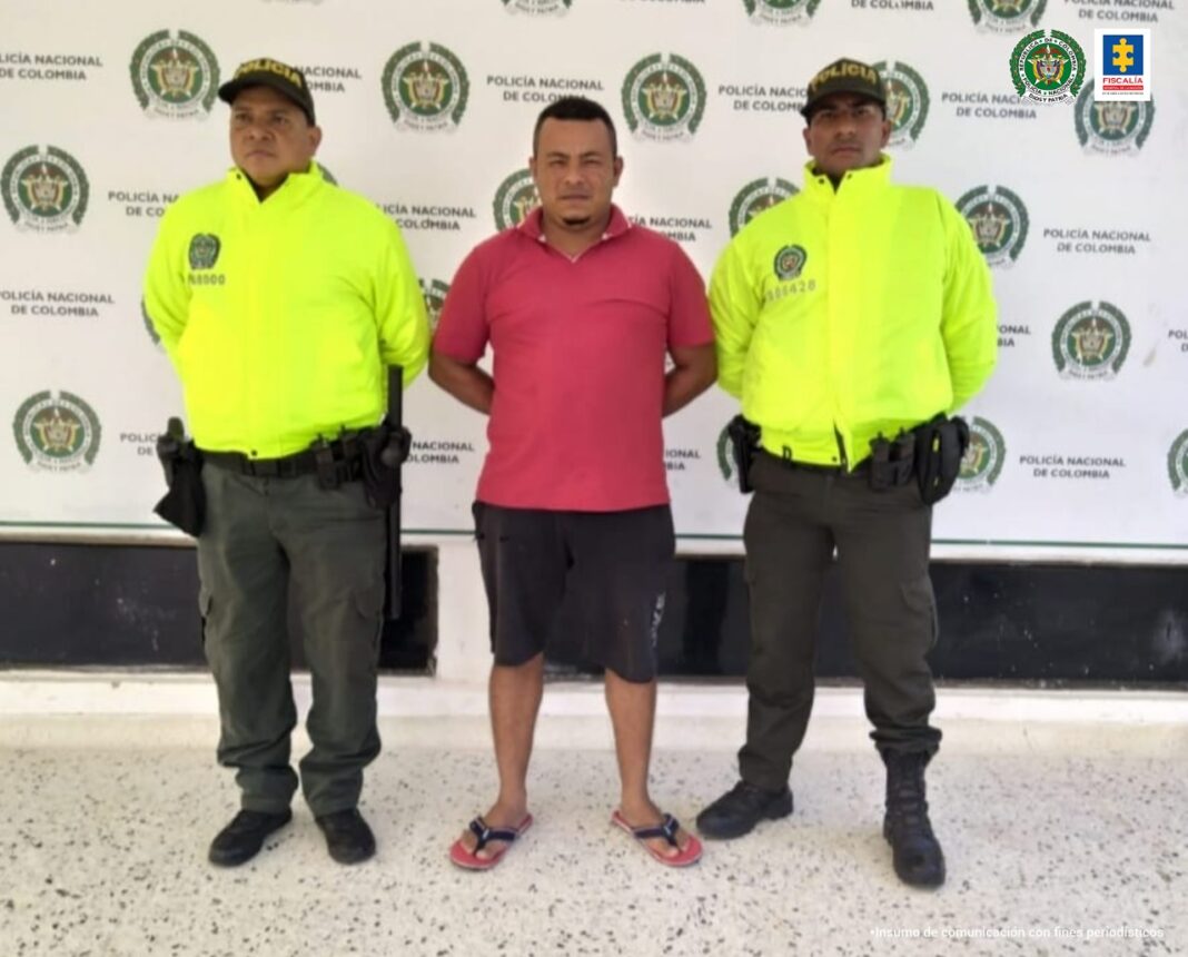 En la fotografía aparece  un hombre capturado, acompañado de dos uniformados de la Policía Nacional. En la parte posterior un banner con logos de la entidad.