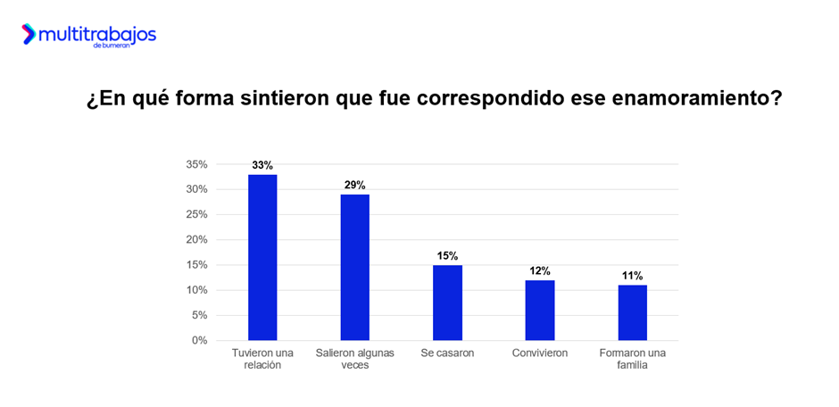 ¿Qué pasó con estos sentimientos? El 33% de los talentos indicó que mantuvo una relación amorosa con esa persona de su trabajo; el 29% aseguró que salió o tuvo citas en algunas ocasiones; y el 15% contrajo matrimonio.