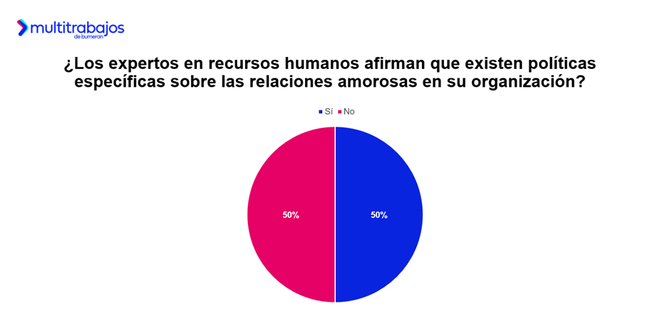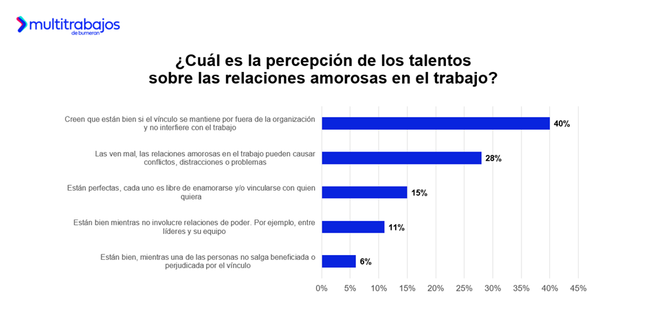 Respecto a lo que harían si se enamoran de un par en el trabajo y la organización prohíbe esas relaciones amorosas, el 49% respetaría la política de la empresa y no iniciaría la relación; el 28% intentaría buscar una solución dentro de la organización, como hablar con Recursos Humanos o un superior para explorar excepciones; y el 11% renunciaría y buscaría empleo en otro lugar.