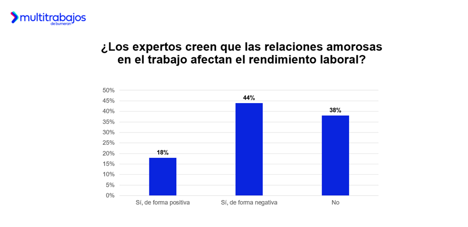 Con relación al impacto de las relaciones amorosas en el rendimiento laboral, el 44% de los expertos cree que tienen un efecto negativo; el 38% considera que no afectan al desempeño de las personas; y el 18% sostiene que impactan de manera positiva en el trabajo.