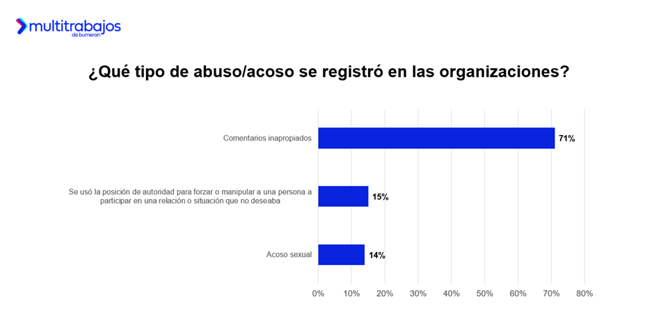 En cuanto a las situaciones de abuso o acoso reportadas, el 71% corresponde a comentarios inapropiados; el 15% señala el uso de una posición de autoridad para forzar o manipular a alguien a participar en una relación o situación no deseada; y el 14% se refiere a casos de acoso sexual.