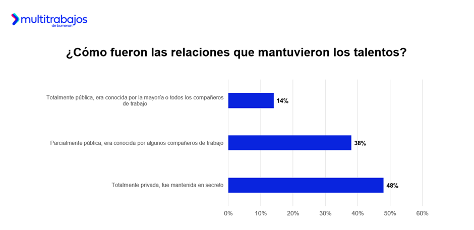 El 48% de los talentos que afirman haber tenido una relación amorosa en el trabajo, lo hicieron en secreto; el 38% la mantuvo parcialmente pública, lo que significa que era conocida sólo por algunas de las personas de su trabajo; y solo el 14% asegura que fue totalmente pública, siendo conocida por la mayoría o todos sus colegas en la oficina.