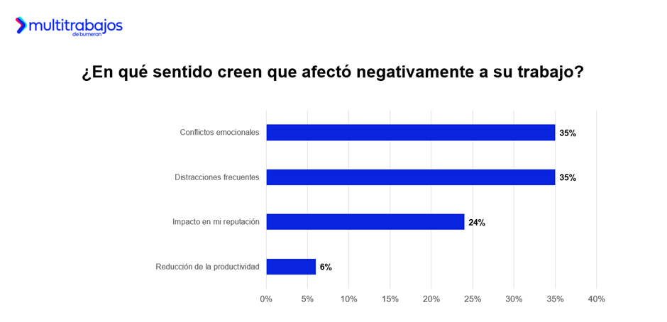 En contraste, entre quienes consideran que la relación los afectó negativamente, señalan: el 35% enfrentó conflictos emocionales; otro 35% afirma que sufrió distracciones frecuentes; el 24% tuvo un impacto en su reputación; y el 6% experimentó una reducción de su productividad.