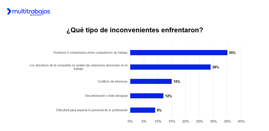 Además, el 41% de las personas que mantuvieron una relación amorosa en el trabajo experimentó inconvenientes relacionados. Las principales problemáticas fueron rumores o comentarios entre pares (35%); la falta de aprobación por parte de los directivos respecto a las relaciones amorosas en el trabajo (29%); conflicto de intereses (15%); discriminación o trato desigual (12%); y dificultad para separar lo personal de lo profesional (9%).