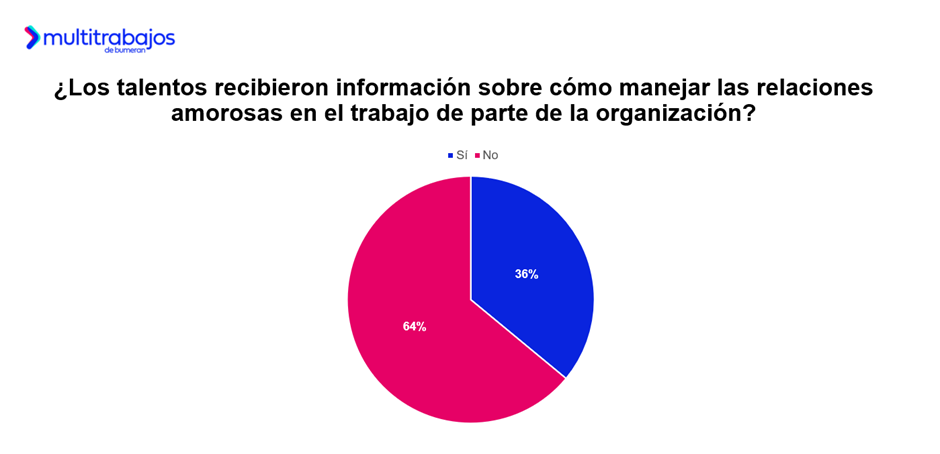 El 36% de las personas trabajadoras afirma que recibió información por parte de la organización sobre cómo llevar adelante las relaciones amorosas en el trabajo, el porcentaje más alto de la región. Le sigue Panamá con el 35%; Perú con el 26%; Argentina con el 20%; y Chile con el 16%.