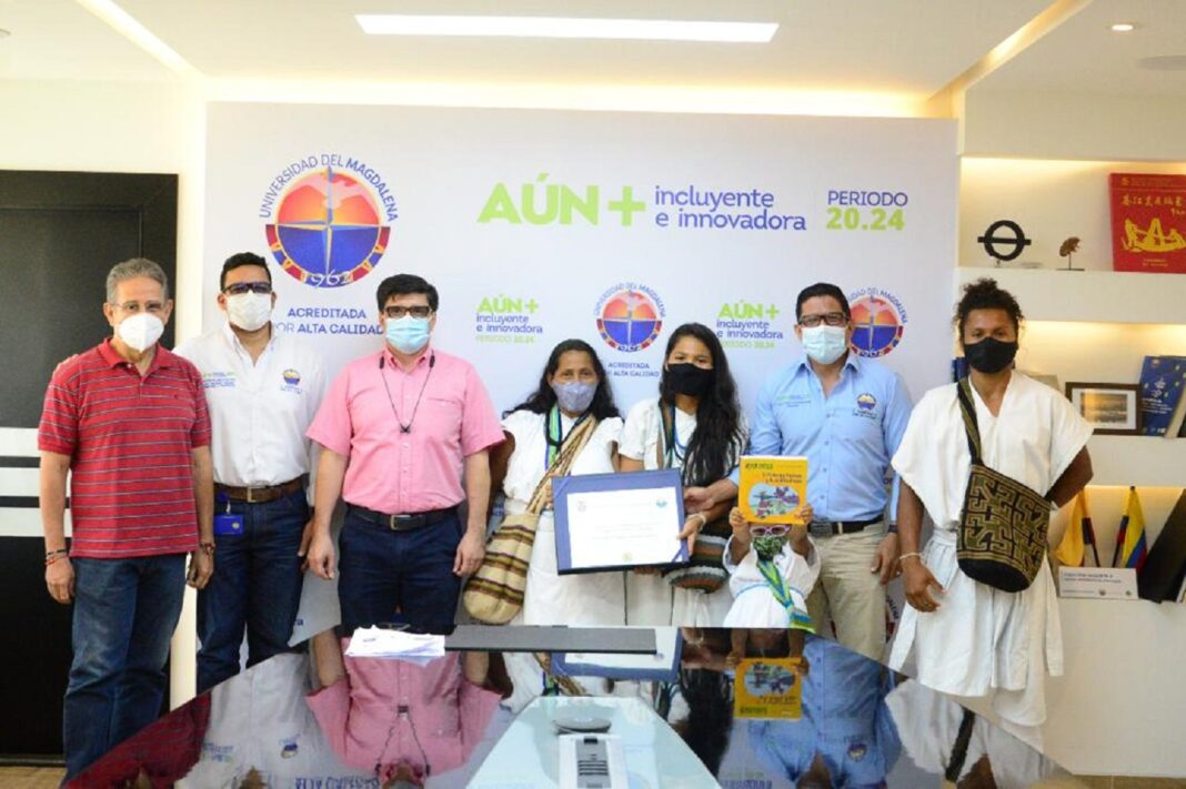 El Rector de la Universidad del Magdalena, Pablo Hernán Vera Salazar, le entregó la Beca Sierra Nevada a la egresada del Programa de Economía, Sonia Ati Gúndiwa Villafaña Mejía, miembro de la comunidad indígena Arhuaca, para que curse la Maestría en Desarrollo Territorial Sostenible.