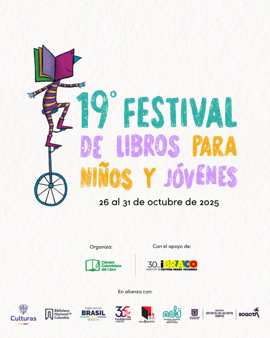 Del 26 al 31 de octubre, regresa el Festival de Libros para Niños y Jóvenes, organizado por la Cámara Colombiana del Libro, con el apoyo del Instituto de Cultura Brasil Colombia – Ibraco y el trabajo conjunto de aliados como el Ministerio de las Culturas, las Artes y los Saberes, la Biblioteca Nacional de Colombia, Fundalectura, el Instituto Distrital de las Artes – Idartes, Corpoélite, la Asociación Colombiana de Libreros Independientes (ACLI), la Asociación Colombiana de Literatura Infantil y Juvenil, ACLIJ, y la Embajada de Brasil en Colombia.