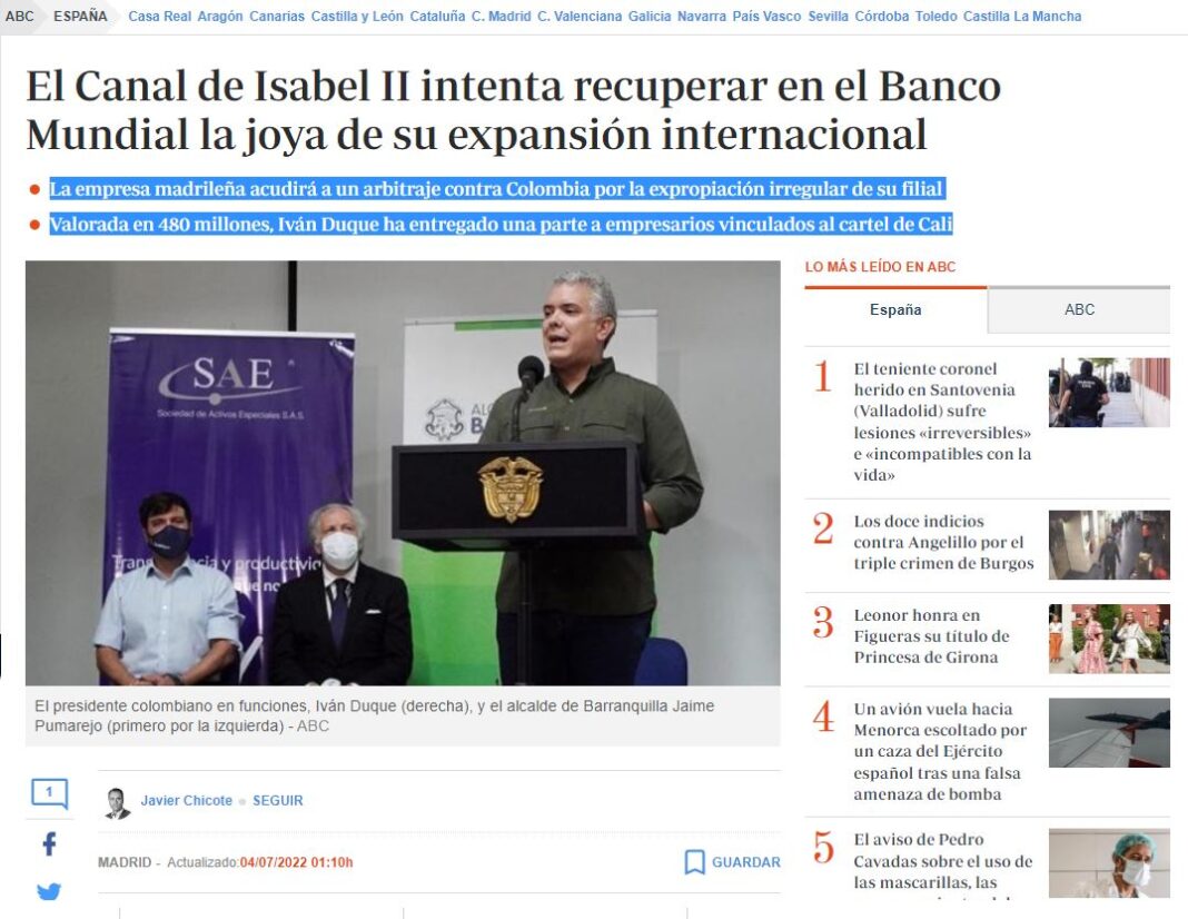 ABC de España dice que la empresa madrileña acudirá a un arbitraje contra Colombia por la expropiación irregular de su filial Valorada en 480 millones de dólares y sostiene que “Iván Duque ha entregado una parte a empresarios vinculados al cartel de Cali”.