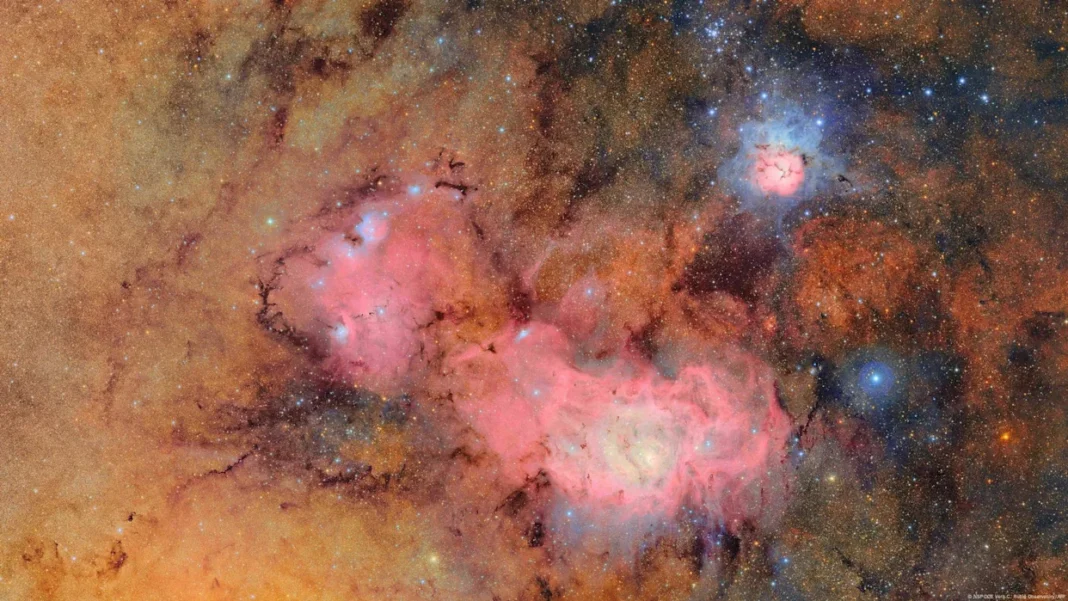 Una de las primeras imágenes es una composición de 678 exposiciones tomadas en solo siete horas, que captura la Nebulosa Trífida y la Nebulosa Laguna, ambas a varios miles de años luz de la Tierra, brillando en vivos tonos rosados sobre un fondo rojo anaranjado.