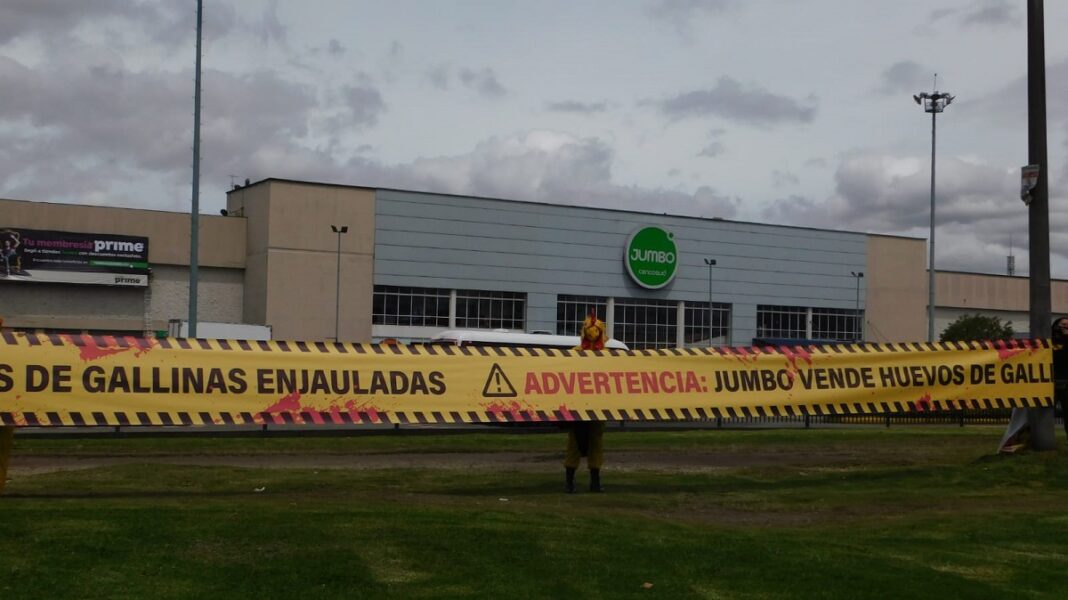 Los activistas de la ONG internacional Sinergia Animal intervinieron la sede de Jumbo de la calle 30 con una cinta de peligro de cerca de 50 metros. El mensaje señala que el grupo empresarial Cencosud, dueño de las marcas Jumbo, Metro y Speed, vende huevos de gallinas enjauladas: un sistema de producción controversial, considerado uno de los más crueles para los animales.