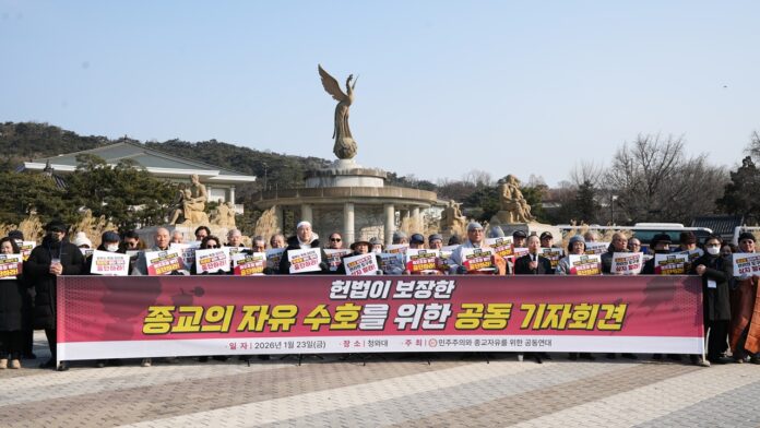 Convocada bajo el lema «Conferencia de prensa conjunta para defender la libertad religiosa constitucional», la reunión respondió a declaraciones realizadas durante un almuerzo del 12 de enero entre el presidente Lee Jae-myung y líderes de siete denominaciones religiosas mayoritarias.