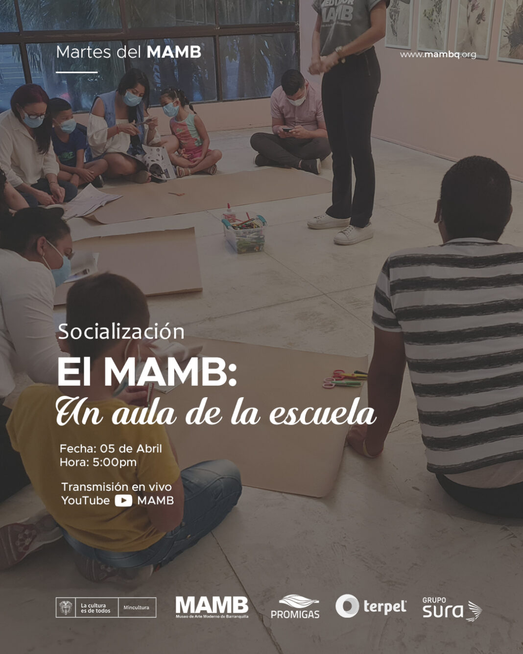 Este martes 5 de abril a las 5:00 de la tarde, por medio de una transmisión en vivo en el canal de YouTube del Museo de Arte Moderno de Barranquilla, se llevará a cabo la actividad de “Martes del MAMB” con la socialización del proyecto El MAMB: Un aula de la escuela.