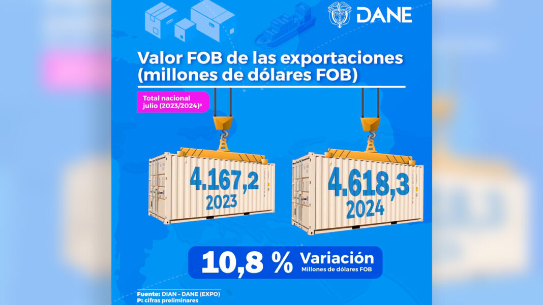 Las exportaciones colombianas crecieron en 10,8% durante julio de 2024 frente al mismo mes del año pasado, y alcanzaron un total de US$4.618,3 millones FOB, según la información de la Dirección de Impuestos y Aduanas Nacionales (DIAN) y el Departamento Administrativo Nacional de Estadísticas (DANE).
