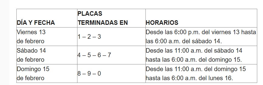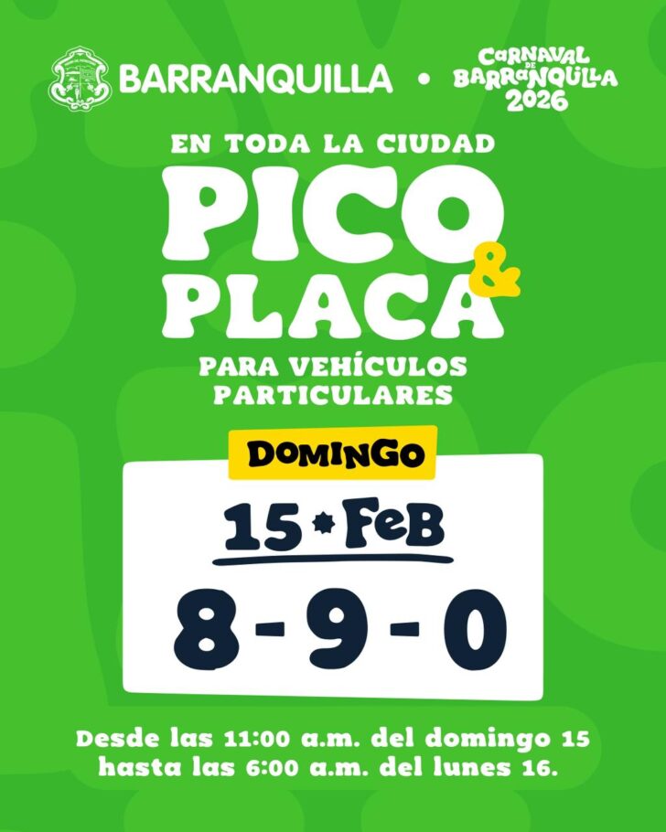 Por tal motivo, la Alcaldía de Barranquilla, a través de la Secretaría de Tránsito y Seguridad Vial, mediante el Decreto 0036 del 26 de enero de 2026, dispuso la implementación de la medida de pico y placa en toda la ciudad desde el viernes 13 de febrero hasta el lunes 16 de febrero, teniendo en cuenta el último dígito del número de placa:
