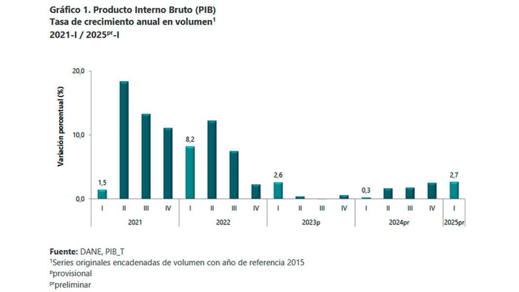 Entre enero y marzo de 2025, el Producto Interno Bruto (PIB) de Colombia en su serie original creció 2,7 % respecto al mismo periodo de 2024, reveló el Departamento Administrativo Nacional de Estadística (Dane).