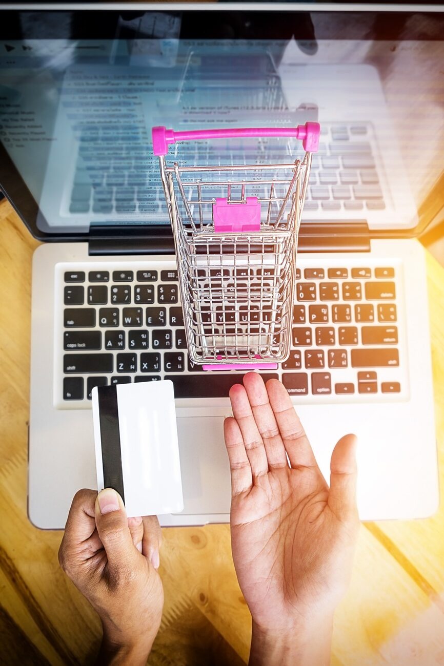 Cropped image of woman inputting card information and key on phone or laptop while shopping online.