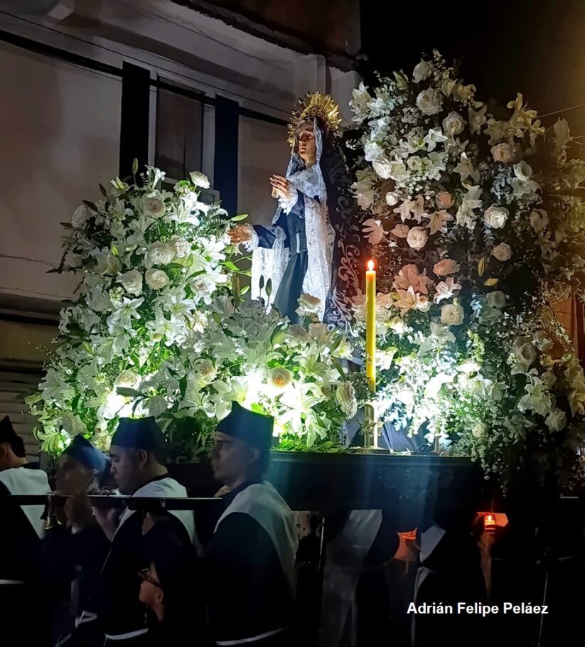 “Aunque todas estaban un tanto abandonadas por el tiempo y el uso, cada quien fue tomando una de ellas para arreglarlas y prepararlas para la primera Semana Santa. Recordamos al Señor Caído, a la Magdalena, a San Pedro y a nosotros nos tocó a Santiago. Después supimos que era el de Santiago de Compostela, le tomamos mucho cariño, tanto mi mamá, como todos los de la familia. Le hicimos los primeros mantos y comenzaron a llegar los cargadores y cada año esperamos que se luzca. Para este año le hicimos tres túnicas y le trajimos rosas rojas desde Ecuador”, cuenta María Fernando Melo, la síndica de Santiago, uno de los Hijos del Trueno, con su hermano Juan.