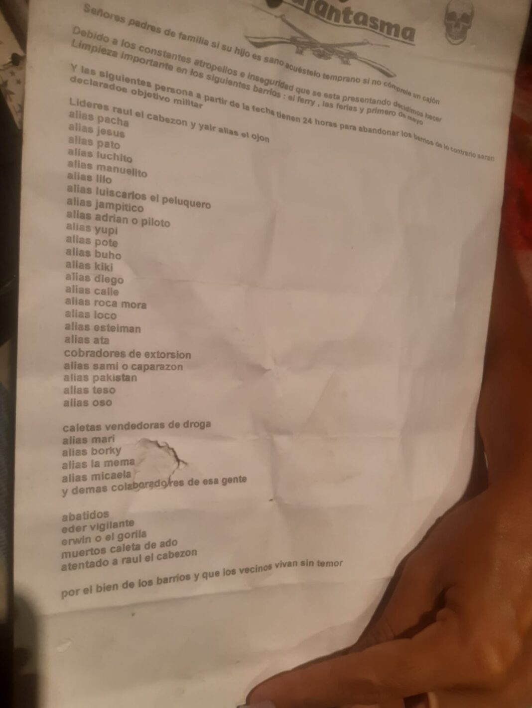 Desde primeras horas de la mañana el miedo se apoderó de las familias en barrios del suroriente de Barranquilla y los límites con Soledad en el Área Metropolitana del Distrito. El panfleto que circula y llena de terror esas zonas habla de la muerte de presuntos 25 delincuentes y la intervención en cinco casas de venta de drogas. Igualmente se refiere a que ya fueron abatidos cuatro presuntos maleantes con sus alias.