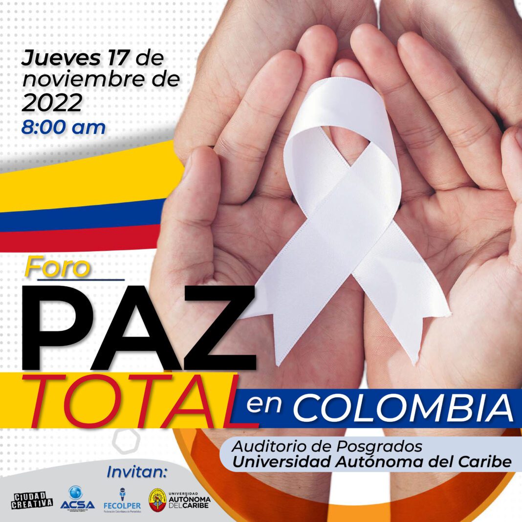 Los periodistas de la Región Caribe se darán cita el próximo jueves 17 de noviembre en el FORO PAZ TOTAL EN COLOMBIA, RETOS DE LA PRENSA, SOCIEDAD Y ESTADO que se realizará a partir de las 8 de la mañana en el Auditorio de Postgrados de la Universidad Autónoma del Caribe en la ciudad de Barranquilla, con el fin de analizar desde el lente del periodismo el marco legal y social de la propuesta del gobierno del Presidente Gustavo Petro.