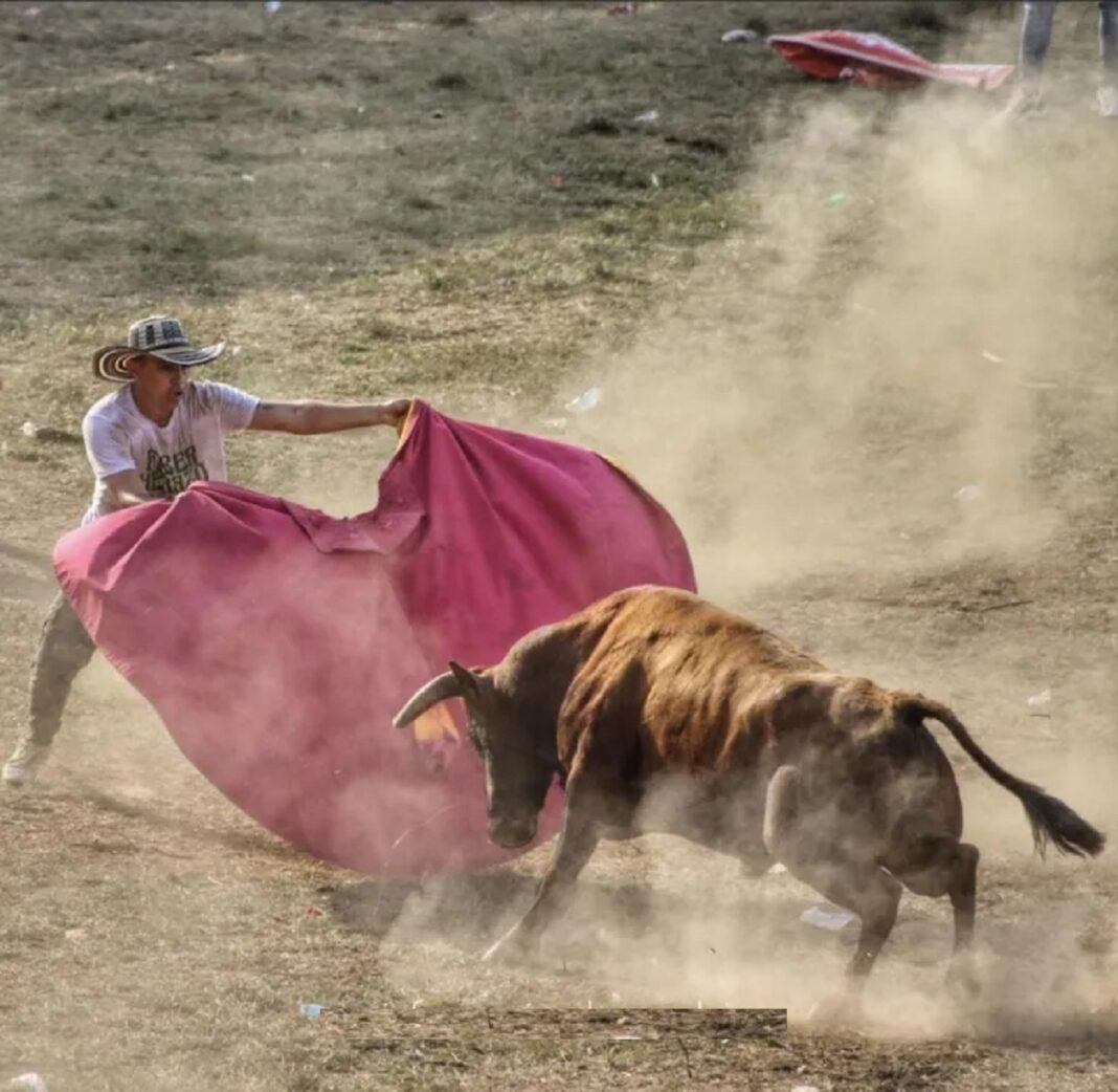 En el ruedo unos 5 caballos con sus varas están anhelantes. Unos 100 muchachos intrépidos esperan la salida del toro de casta, muchas veces lidiado y ya conocido por la afición y los toreros. De pronto, dentro de ese grupo, un joven delgado, con camisa a cuadros, sombrero vueltiao, levanta un par de banderillas y se dispone a recibir a un jabonero que sale a toda velocidad.
