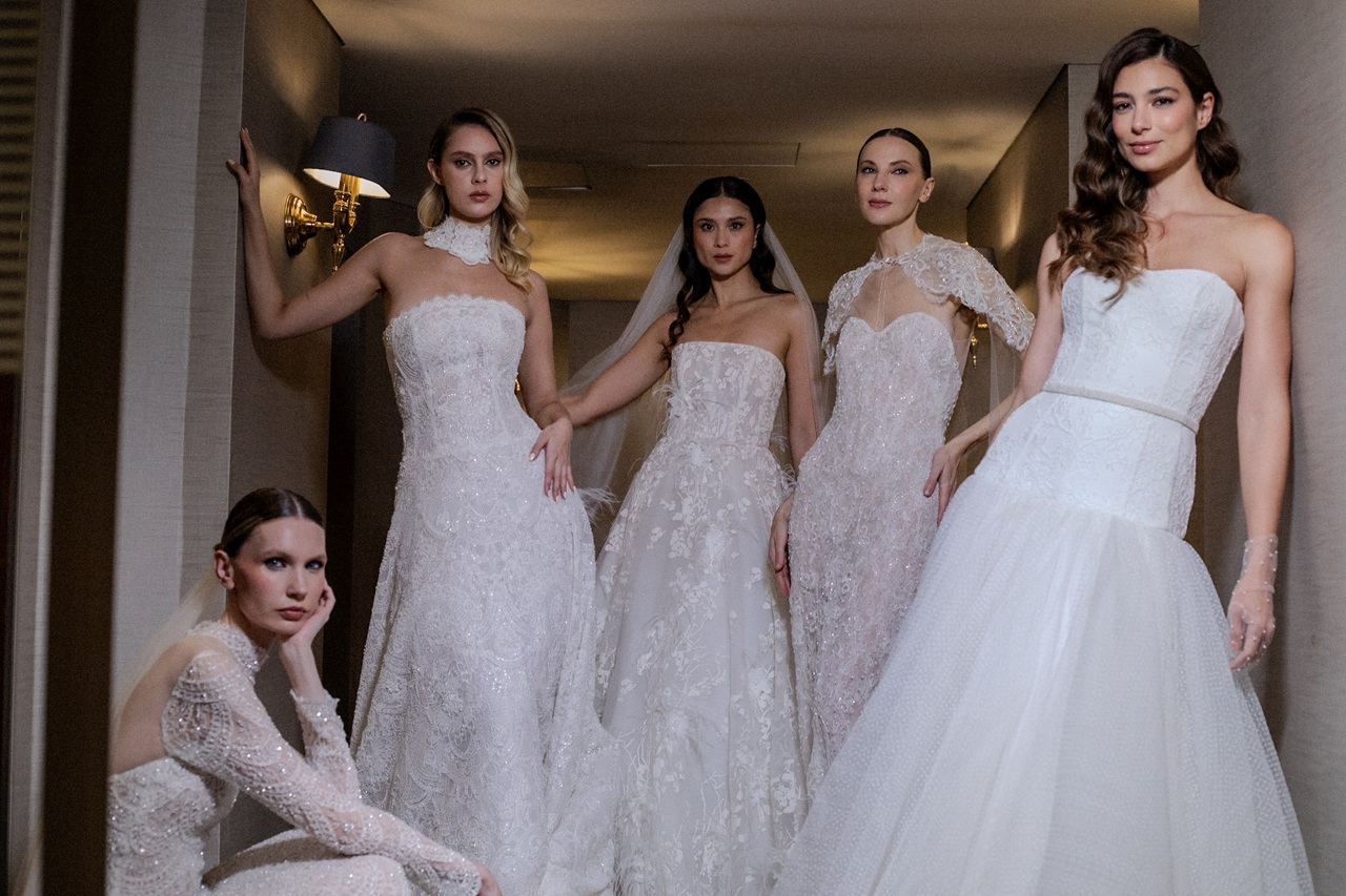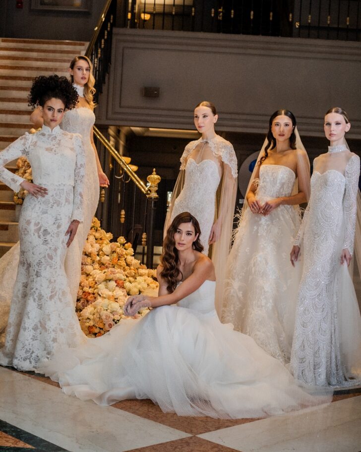 Una colección que explora la textura como un verdadero lenguaje de emoción, donde el tul de lunares y los encajes delicados se entrelazan con rosas de organza esculpidas minuciosamente, mientras que la pedrería aplicada a mano captura un equilibrio perfecto entre suavidad y estructura.