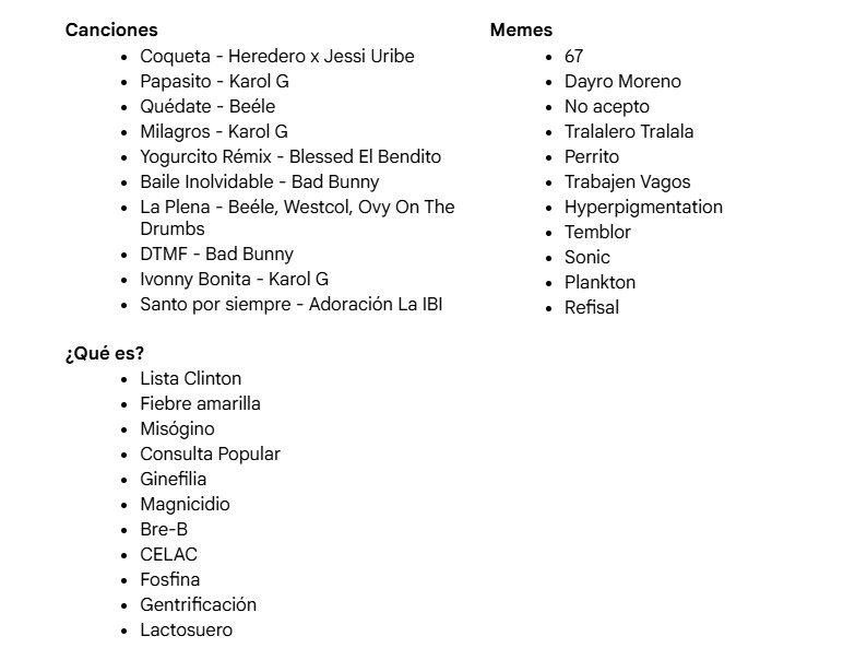 En cuanto a búsquedas explicativas, hubo un notable interés en ampliar el entendimiento de la Lista Clinton, Ginefilia y el concepto de “Consulta Popular”. En el ámbito musical, las canciones más consultadas fueron “Coqueta” de Heredero x Jessi Uribe, “Papasito” de Karol G y “Quédate” de Beéle. Por último, los memes que resaltaron por un porcentaje de búsqueda destacado fueron 67, Dayro Moreno y No acepto.