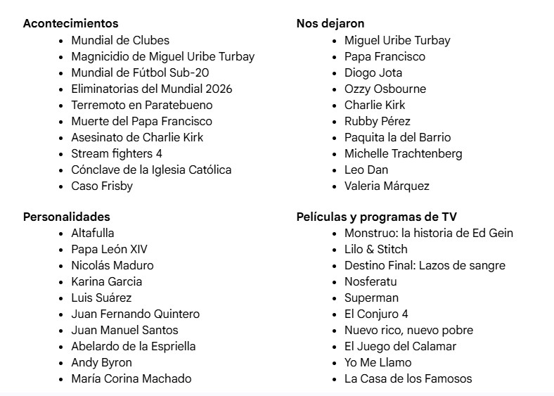 Entre las personalidades más influyentes del año estuvieron Altafulla, el Papa León XIV, Luis Suárez y Juan Fernando Quintero. La atención en contenido audiovisual se  centró en películas como “Monstruo: La historia de Ed Gein”, “Lilo & Stitch” y “Destino Final: Lazos de Sangre”. Nuevos formatos de entretenimiento televisivo como “Nuevo Rico, nuevo pobre”, “Yo Me Llamo” y “La Casa de los Famosos” lograron captar la atención de los usuarios y destacarse como un criterio de búsqueda notable a lo largo del año.