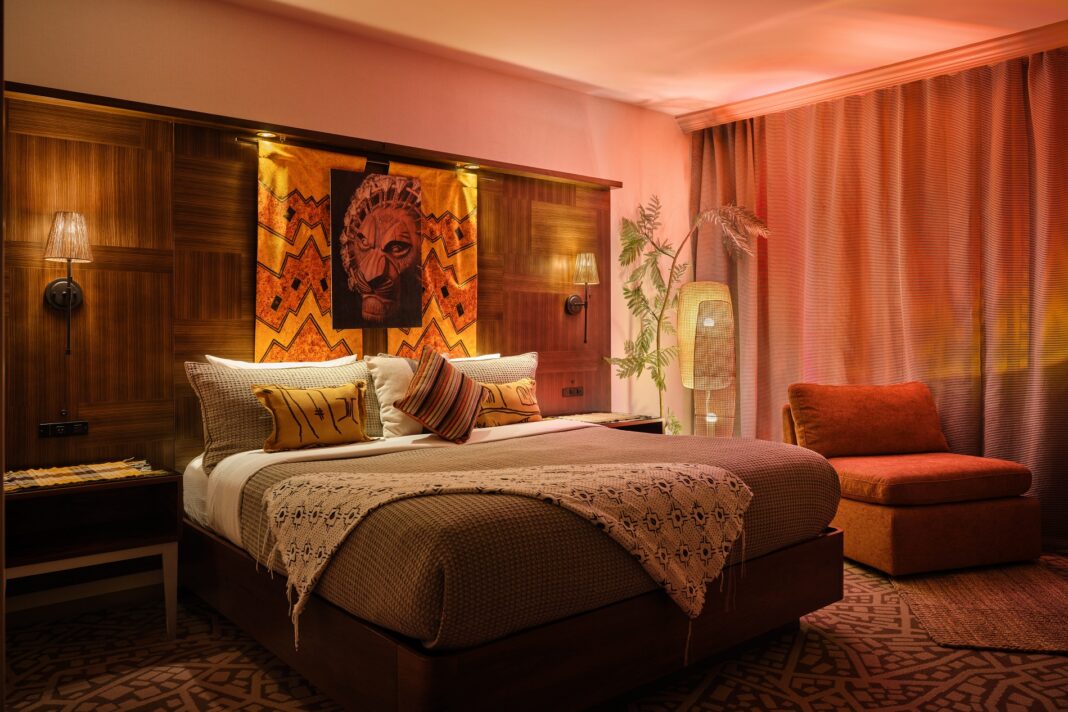 La impresionante y espaciosa suite de lujo de un solo dormitorio permite disfrutar de la paz y la belleza de las Tierras del Orgullo. Al llegar a la suite, los huéspedes se verán inmediatamente transportados al Serengeti, con detalles que rinden homenaje a la obra de Disney THE LION KING on Broadway, como grandes cestas tejidas, plantas que se asemejan a la hierba que se extiende por las llanuras africanas, adornos pintados a mano inspirados en Rafiki que decoran el mobiliario de la habitación y un gran dibujo de Rafiki que enmarca la entrada de la suite. Los huéspedes también encontrarán telas utilizadas en el musical expuestas en artículos como alfombras, almohadas y ropa de cama, con elementos de madera decorando el espacio.