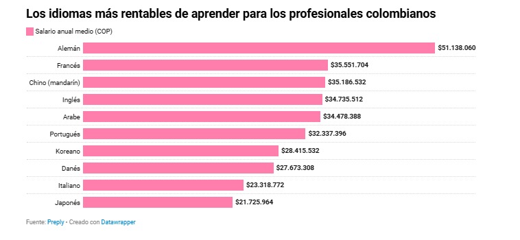 De acuerdo con un estudio de la plataforma global de aprendizaje de idiomas Preply, que hizo un vasto análisis de los idiomas más demandados y mejores pagados en el mercado laboral del país, con un salario promedio de $51 138 060 COP (11 200 €), las personas que hablan alemán ganan, en promedio, un 86 % más que el salario nacional (20 468 099 COP / 4 500 €), lo que confirma que los idiomas europeos siguen siendo altamente valorados en la región.