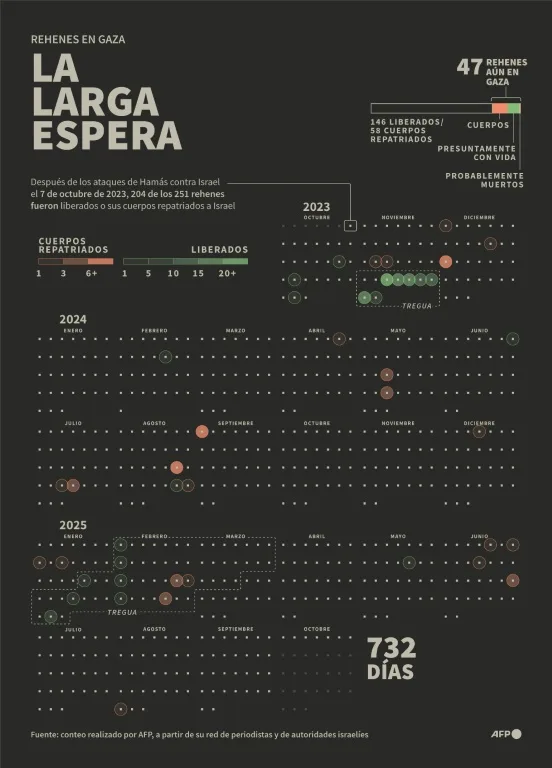 Hamás y su aliado, la Yihad Islámica, también retienen los cadáveres de 25 rehenes del 7 de octubre, cuya muerte confirmó el ejército israelí. Al menos 17 de ellos fueron asesinados el día del ataque y trasladados muertos a Gaza, según el ejército israelí.