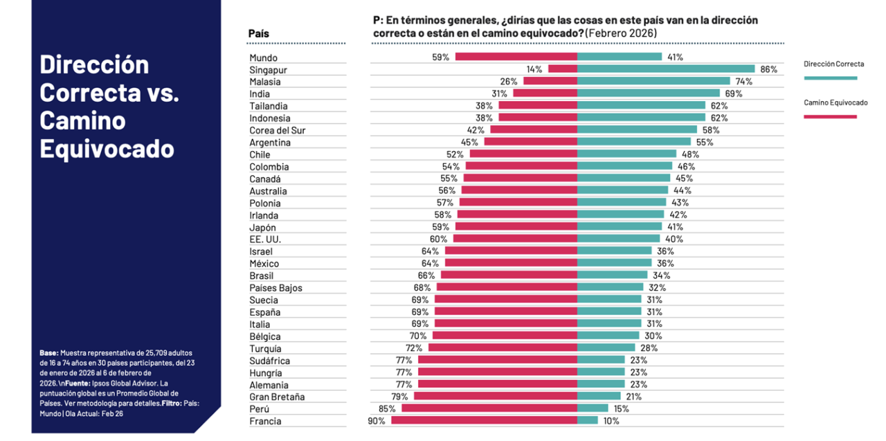 En el plano económico, dos de cada tres argentinos (66%) consideran que la economía del país atraviesa un momento negativo. Al analizar las preocupaciones específicas de la población, el desempleo aparece como el principal problema mencionado por los argentinos, con un 47%, lo que posiciona al país entre los más preocupados del mundo por esta cuestión. Le siguen la seguridad y la violencia (46%) y la pobreza y la desigualdad social (40%), confirmando que los temas vinculados a la estabilidad económica y social continúan dominando la agenda pública.