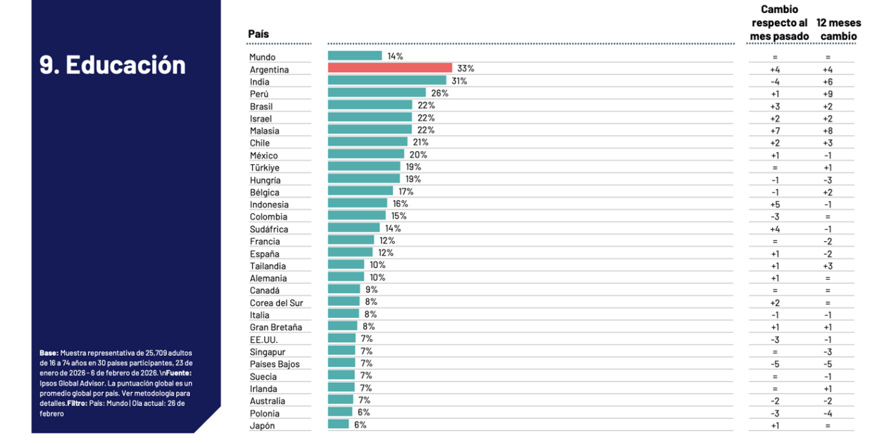 La última ola de la investigación de Ipsos revela que Argentina se posiciona como el país donde más preocupa la educación en el mundo, mientras que la inseguridad y la corrupción dominan las inquietudes en América Latina