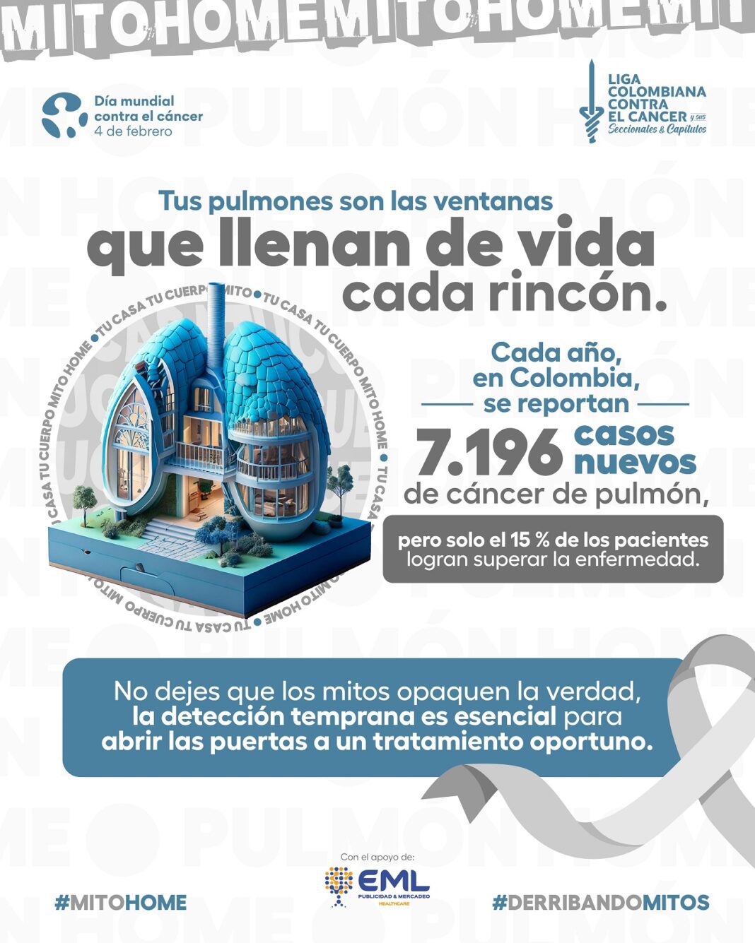 El cáncer tiene cura si se detecta a tiempo ya que un diagnóstico temprano y un tratamiento oportuno y adecuado maximiza las posibilidades de supervivencia en un 90%.Para la conmemoración de este importante día, la Liga Colombiana Contra el Cáncer, sus Seccionales y Capítulos, lanzan la campaña ‘Mi casa, mi cuerpo. Mito Home’ la cual hace énfasis en la importancia del autocuidado del cuerpo para prevenir diferentes tipos de cáncer por medio de acciones que hacen la diferencia como visitas periódicas al médico, buena alimentación, hábitos de vida saludable, prestar atención a los signos de alerta que se manifiestan físicamente y los exámenes de tamización oportuna. Todo esto en una representación de un conjunto de casas que forman el cuerpo humano.