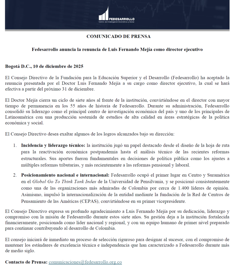 El exministro Luis Fernando Mejía confirmó que el Consejo Directivo de Fedesarrollo ha aceptado su renuncia como Director Ejecutivo, efectiva el 31 de diciembre.