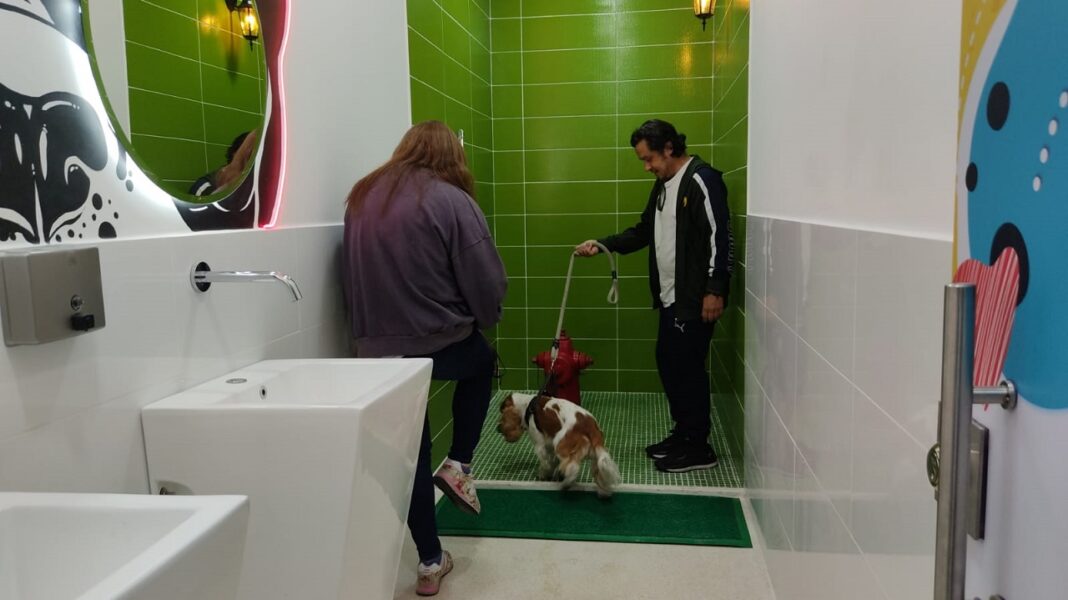 El espacio de más de 7 metros cuadrados tiene en el fondo una boca de incendios para provocar que las mascotas ‘liberen sus necesidades’. El equipo del servicio para animales incluye también una estructura en porcelanato verde simulando el tono de césped artificial, desodorizantes, dos lavamanos y sus espejos con silueta de perro para aprovechar las selfies y un dispensador de bolsitas ecológica para que los dueños recojan los excrementos, estructura que incluye una pantalla con recomendaciones conforme el reglamento Petfriendly del Centro Comercial.
