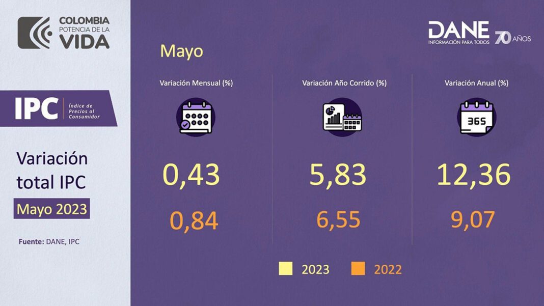 La Directora del Departamento Administrativo Nacional de Estadística (DANE), Beatriz Urdinola, explicó en los micrófonos de ‘Colombia Hoy Radio’ las cifras del Índice de Precios al Consumidor (IPC), conocido popularmente como inflación, que para el mes de mayo registró una variación mensual y anual de 0,43% y 12,36%, respectivamente.