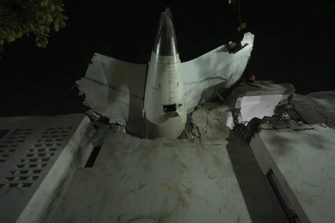 Los restos de un avión sobresalen de un edificio después de estrellarse en la ciudad de Ahmedabad, en el noroeste de la India, en el estado de Gujarat, el jueves 12 de junio de 2025 – Créditos: @Ajit Solanki