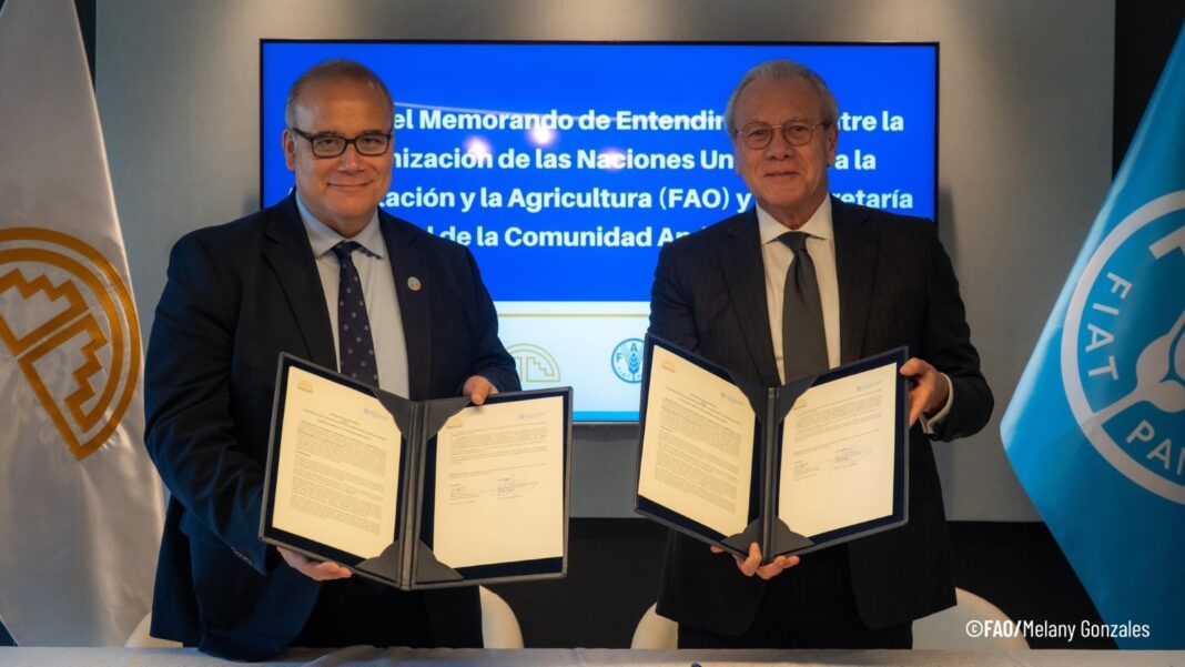 Lima, Perú; 11 de junio de 2025.- La Organización de las Naciones Unidas para la Alimentación y la Agricultura (FAO) y la Secretaría General de la Comunidad Andina (SGCAN) firmaron un nuevo Memorando de Entendimiento con el objetivo de establecer un marco de colaboración que impulse la seguridad alimentaria, el desarrollo rural sostenible e inclusivo, y la sanidad agropecuaria en Bolivia, Colombia, Ecuador y el Perú.