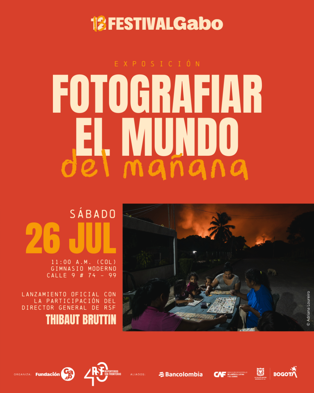 Para celebrar sus 40 años de existencia, RSF presenta por primera vez en América Latina la exposición global “Fotografiar el mundo del mañana”. A través de las imágenes de fotoperiodistas internacionales, la muestra retrata el estado de un mundo en transformación en tres ámbitos: medio ambiente, exilio y crisis. La exposición fue inaugurada en París y ya ha recorrido ciudades como Berna y Bruselas. En el Festival Gabo, el lanzamiento oficial tendrá lugar el sábado 26 de julio a las 11:00 a.m., en el Gimnasio Moderno, con la participación del director general de la organización, Thibaut Bruttin.