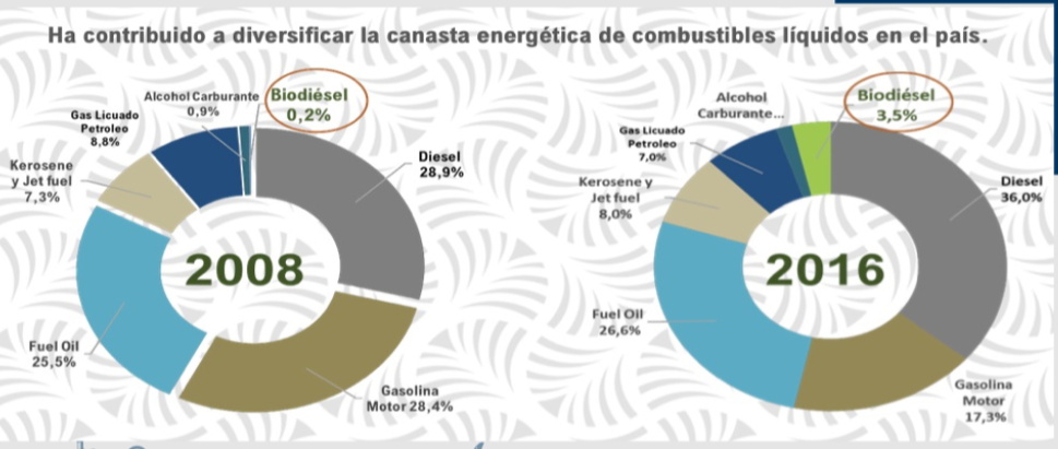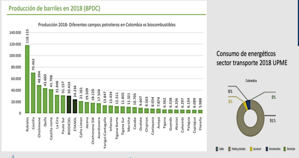Como es bien sabido Colombia importa el 40% de la gasolina y el 10% del diésel que se consume en el país, ello a causa de las limitaciones que acusan sus dos refinerías, la de Barrancabermeja y la de Cartagena, las que opera ECOPETROL. De modo que el 10%, en promedio, de la mezcla del etanol y el biodiesel, es el mismo porcentaje en el que se reduce la dependencia de las importaciones y de paso el déficit de la Balanza comercial. La producción total de biocombustibles se equipara hasta superarlo con el segundo mayor campo productor de crudo que se explota en el país, Castilla, contribuyendo a la seguridad y a la diversificación de la matriz energética.