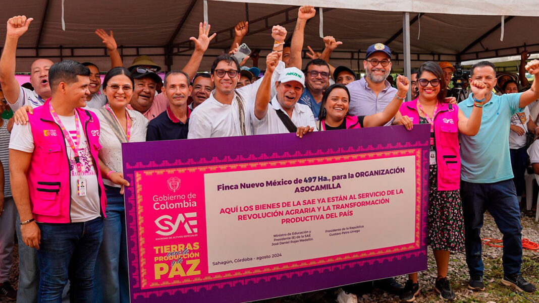 La Sociedad de Activos Especiales (SAE) entregó este jueves cinco fincas, 1.378 hectáreas en total, a 300 campesinos en Sahagún (Córdoba), terrenos que fueron usados en actividades ilegales y que ahora serán utilizados para mejorar la calidad de vida de las comunidades locales y dinamizar la economía popular de la región sabanera.
