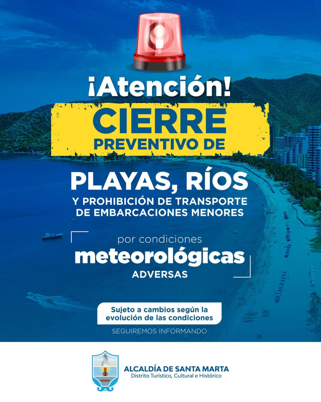 La Alcaldía Distrital de Santa Marta informó a la comunidad local, visitantes y operadores turísticos, que debido a las condiciones meteorológicas que actualmente afectan la región, se ha determinado el cierre preventivo de las siguientes playas: