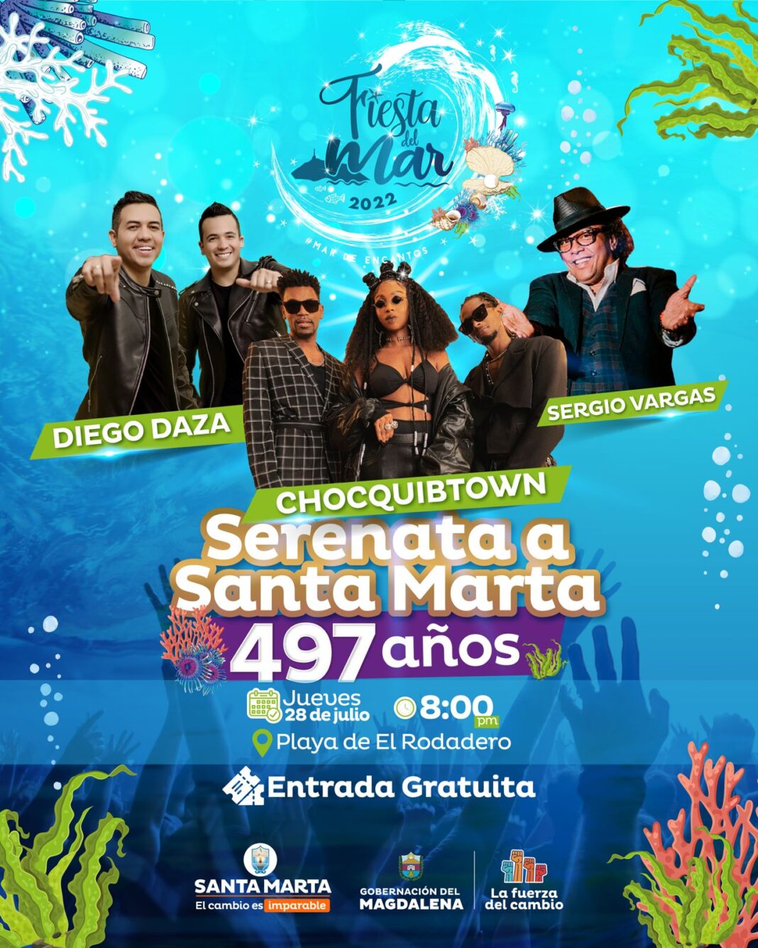 En el marco de la tradicional “Serenata a Santa Marta 497 años”, que será el jueves 28 de julio a partir de las 8:00 p.m., se tendrán las presentaciones musicales de Diego Daza, Choquibtown y Sergio Vargas en la tarima ubicada en la playa de El Rodadero, en donde se desarrollarán todos los conciertos.