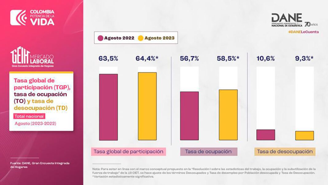 El Departamento Administrativo Nacional de Estadística (Dane) reveló este viernes que la tasa de desempleo para agosto de 2023 fue de 9,3%, lo que representa una reducción de 1,4 puntos porcentuales (p.p.) frente al mismo mes de 2022, cuando se ubicó en 10,6%.