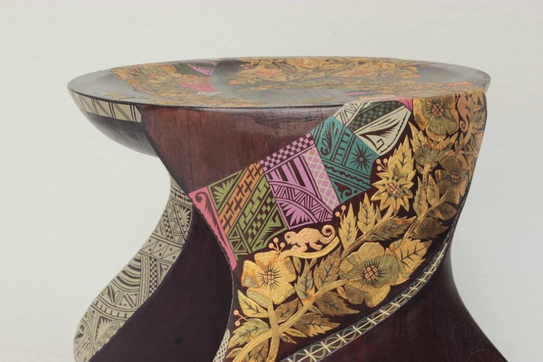 Tinku es un mueble tallado en madera y decorado con Barniz de Pasto, combina elementos como madera tallada y decorada con mopa-mopa, logrando una pieza que destaca por su belleza estética y su capacidad de narrar historias.