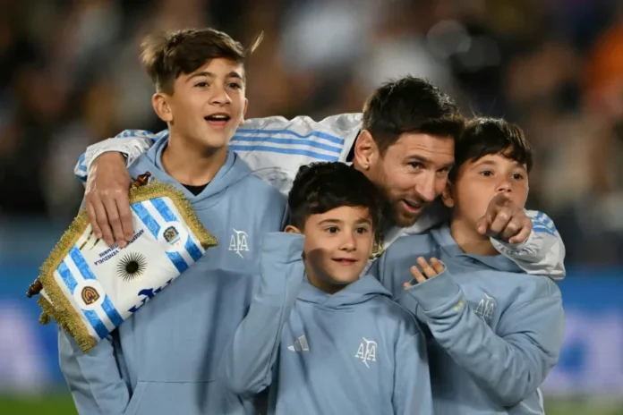 El astro Lionel Messi abraza a sus hijos antes del partido clasificatorio entre Argentina y Venezuela, su último juego oficial en su país, en el estadio Monumental de Buenos Aires el 4 de septiembre de 2025 (Luis ROBAYO)