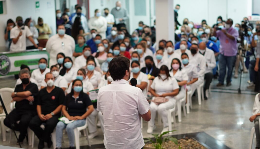 El alcalde de Barranquilla, Jaime Pumarejo Heins, en compañía de representantes de las autoridades distritales, gremios, talento humano en salud, comunidad, vacunadores, sobrevivientes, medios y demás asistentes, rindió un homenaje a todo el equipo de trabajadores de la salud que han sorteado los desafíos de salvar vidas en medio de la emergencia mundial a causa del COVID-19.